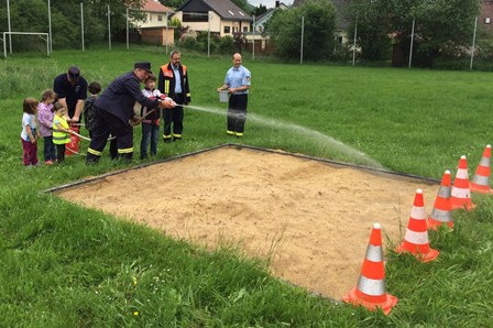 Es war schon aufregend für die Kinder, denn sie wussten nicht was auf sie zukam. Die Mitglieder der Jugendfeuerwehr nahmen es gelassener, hatten sie doch schon öfters an solchen Veranstaltungen teilgenommen. Zu bewältigen war eine Strecke von 2,4 Km, gespickt mit verschiedenen Einlagen. So mussten an einer Station Klicker in einem Sandbett gesucht werden. Je nach Farbe der Murmel gab es Punkte, die im Wertungsbogen eingetragen wurden. An einer anderen Station musste Wasser mit einem Schwamm von Hand zu Hand durch ein Gitter transportiert werden, „Wasserförderung über lange Wegestrecke“. Für das Wasser das im Auffangbehälter landete gab es weitere Punkte. Eine große Herausforderung war der Nachbau einer Figur, die man eine Minute betrachten durfte, mit Legosteinen. Leichter zu meistern war hingegen der Parcours für den Löschangriff mit Kübelspritze. Auf der Suche nach dem Zwilling, so hieß das Memory-Spiel mit 15 Pärchen. Nachdem alle Stationen durchlaufen wurden, kehrten die Gruppen zum Ausgangspunkt, dem Festplatz an der Talbachhalle zurück. Riesige Freude brach bei der Kinderfeuerwehr aus als sie aus den Händen von Landrat Patrik Lauer die Urkunde und vom Bürgermeister der Gemeinde Schmelz, Armin Emanuel, einen Pokal erhielten.